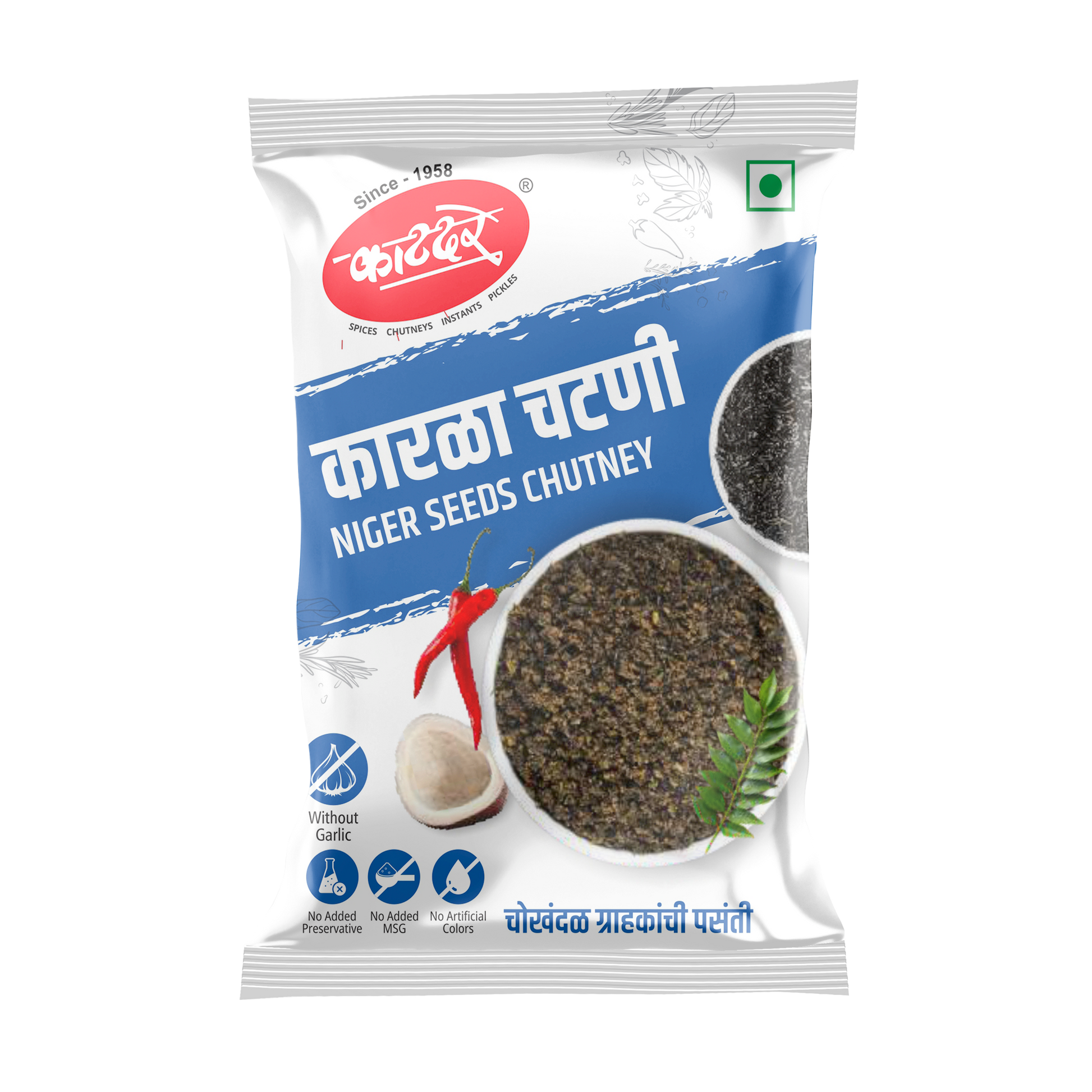Katdare karala chutney is a flavorful condiment made with niger seeds (karala), roasted coconut, and a blend of spices. It is a popular chutney in Maharashtrian cuisine and can be used as a dip or a spread for snacks like vada pav, samosas, or even as a topping for dishes like dosa and idli. The chutney is known for its tangy and slightly bitter taste and has various health benefits due to the presence of niger seeds, which are rich in protein, fiber, and essential nutrients. It is also known by other names like khurasani chutney or karlyachi chutney. Elevate Your Tastes with Karala Chutney - buy कारळा चटणी for a Flavorful Culinary Experience!