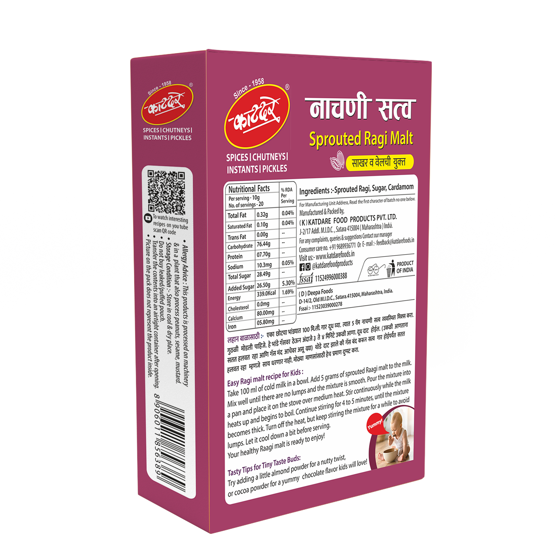 Nachani Satva (With Sugar) by Katdarefoods is a tasty and healthy option for people of all ages. Made from pure Nachani Satva, also known as नाचणी सत्व, it is packed with natural nutrients like calcium and iron. This ready-to-make mix already contains sugar, so you just need to add milk and cook – making it perfect for busy mornings or quick snacks. Whether for kids, elders, or anyone looking for a wholesome treat, Nachani Satva with Sugar is a simple and delicious choice you can enjoy every day.